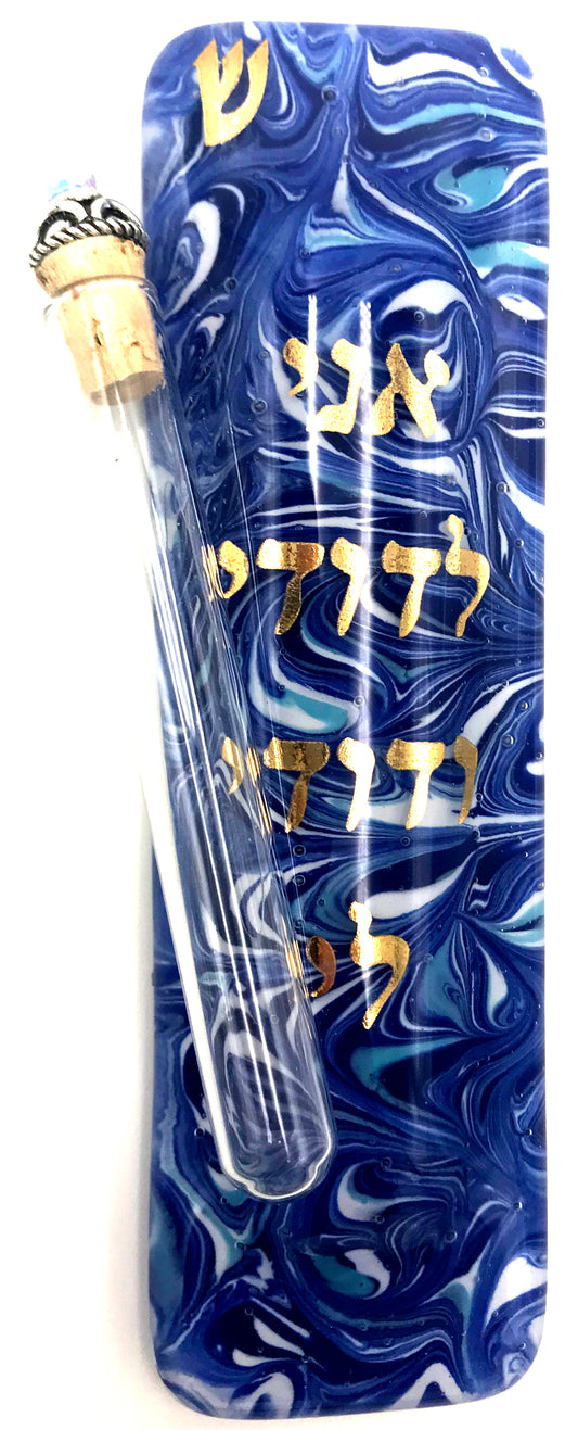 Wedding Mezuzah - Marbled Blue Art Glass