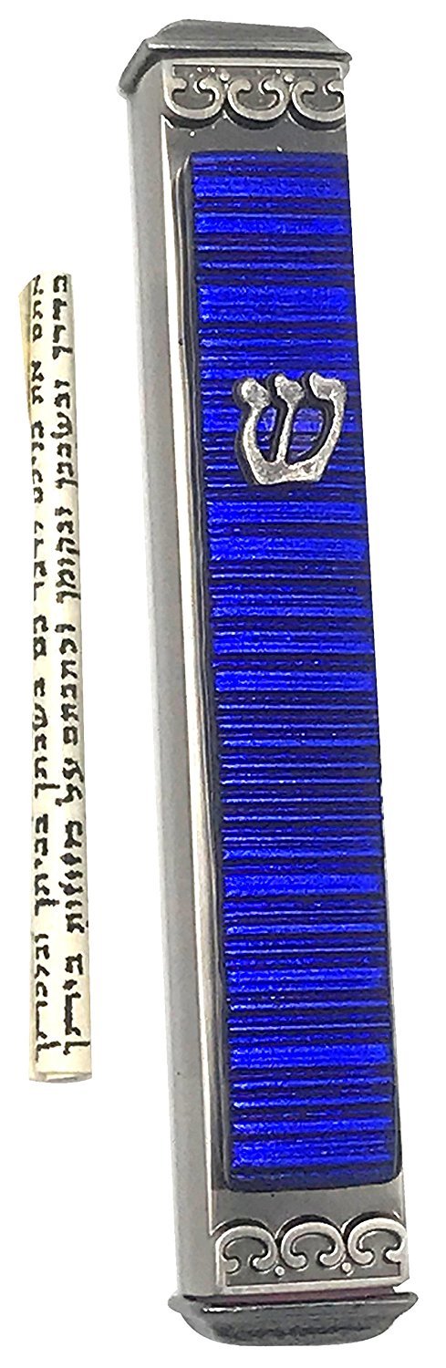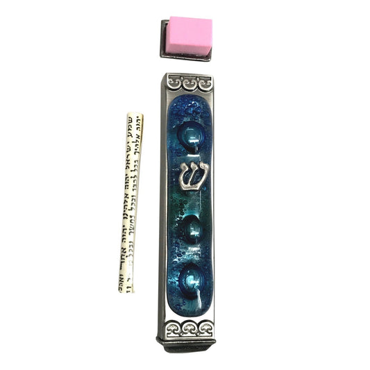 Sparkling Blue Art Glass on Metal Mezuzah
